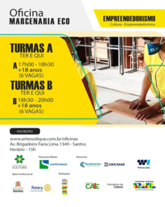 Novidade! Oficina de Marcenaria. Inscrições abertas para a oficina de marcenaria ecológica, essa atividade visa formar novos profissionais. O projeto